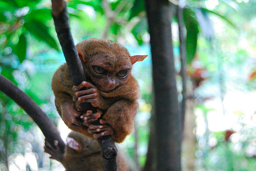 "Tarsier atau Tarsius syrichta adalah sejenis primata yang terkecil di dunia dan bisa ditemukan di Filipina, dan variasi speciesnya ditemukan juga di Sumatra, Borneo, Sulawesi (Indonesia). Matanya yang bulat lebar dan hidungnya yang lucu sangat menarik untuk dilihat sementara ukurannya yang kecil pas banget bila berada di genggaman tangan kita. Jika Anda berkesempatan mengunjungi Filipina, hewan mungil lucu ini dapat Anda temukan pada malam hari di pulau Bohor, Samar, Mindanau, dan Leyte. Hewan mirip monyet ini memakan serangga yang sering keluar dari kayu bekas terbakar atau arang kayu.